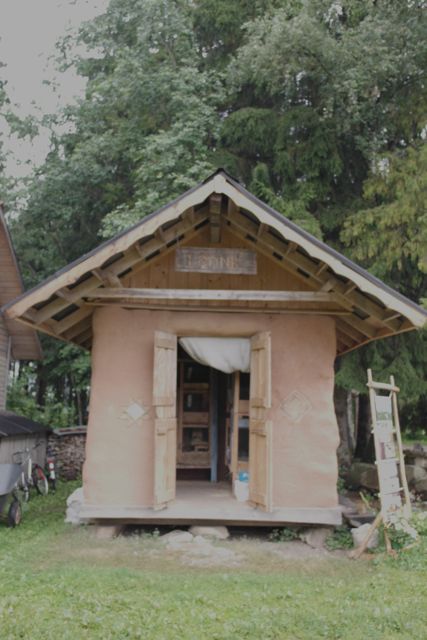 The outside toilet made from cob walls and green roof