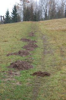 | Another issue we have is the caused by the moles. We must be mole city by now as they are popping up molehills all over the place. This is on the path up to the girls' houses. |